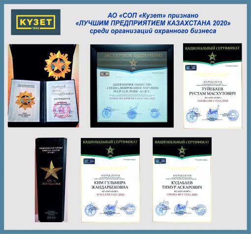 Акционерное Общество «Специализированное охранное подразделение «Кузет» согласно ранжированию Национального Рейтинга качества товаров и услуг «Звезда качества» признано «Лучшим предприятием Казахстана 2020» за неизменно высокое качество услуг и достижение превосходства в бизнесе среди охранных предприятий Казахстана.