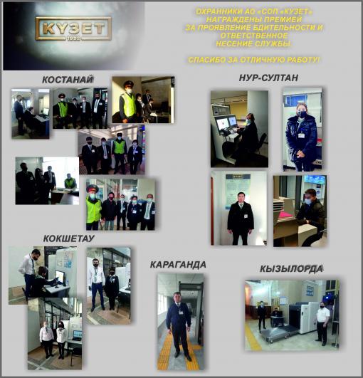 14.04. 2021 г. на пункте досмотра № 1 железнодорожного вокзала станции Караганда-Пассажирская охранник досмотра Шакиров В. обнаружил подозрительный пакет с коробкой, оперативно доложил старшему смены, была оповещена администрация охраняемого объекта, вызваны сотрудники аварийно-спасательных служб, в результате чего была произведена полная эвакуация сотрудников и посетителей вокзала. Действия работников АО «СОП «Кузет» были выполнены в соответствии с утвержденным регламентом по антитеррористической безопасности объектов.